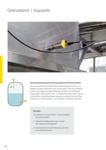 30 Grenzstand l Kapazitiv Vorteile Installation der Grenzschalter in jeder beliebigen Einbaulage möglich Vollisolierte Geräteausführungen messen auch aggressive Flüssigkeiten Kostengünstige Grenzstandmessung für einen wartungsfreien Betrieb Grenzstandmessung mit kapazitivem Grenzschalter Bei der kapazitiven Grenzstandmessung bilden kapazitiver Sensor und Behälter die beiden Elektroden eines Kondensators. Eine durch Füllstandänderung hervorgerufene Kapazitätsänderung wird in ein Schaltsignal umgewandelt. Dank kürzbarer Seil- und Stabausführungen lassen sich die Grenzschalter an jede Anwendung anpassen und dienen häufig als Überfüllsicherung, Trockenlaufschutz, zur Öl-/Wasser- und Schaumdetektion.